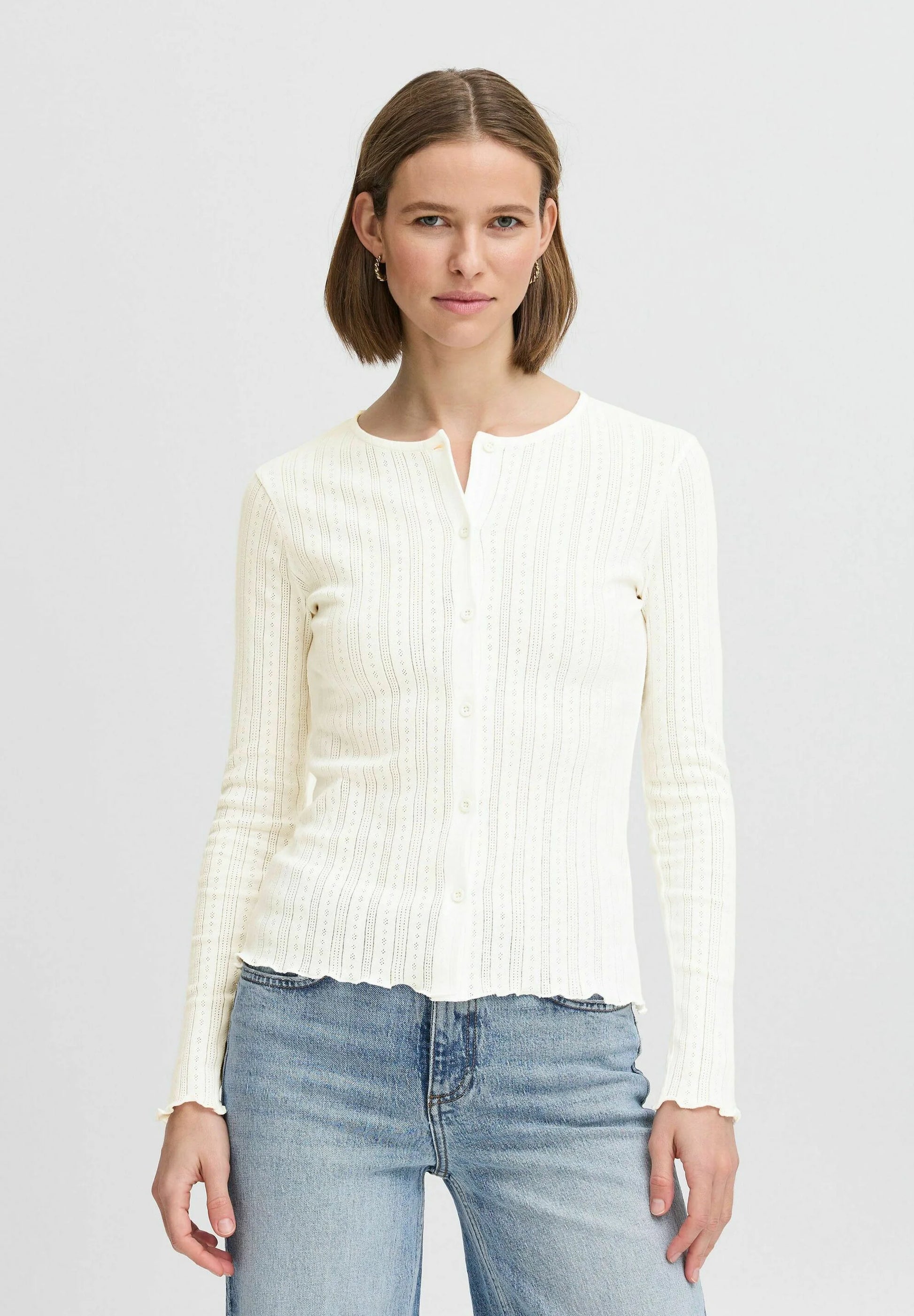 Discover delicate elegance with the b.young Byunica pointelle knit cardigan in off-white.