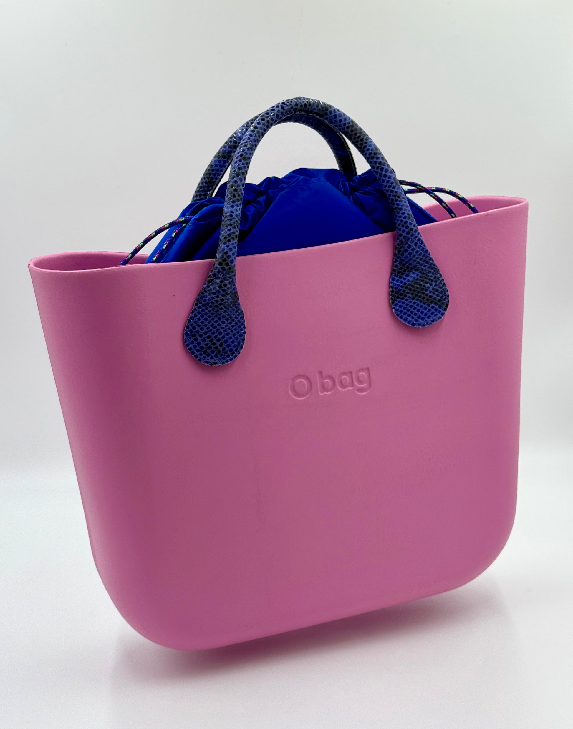 This O bag is a truly special yet easy-to-wear piece: the delicate mauve/purple bag body is made distinctive by striking snake-print (grey-blue) handles. Inside, there's a vibrant blue drawstring inner bag with colorful cord, which is not only stylish but also practical – it helps organize your belongings and makes the bag partially closable.