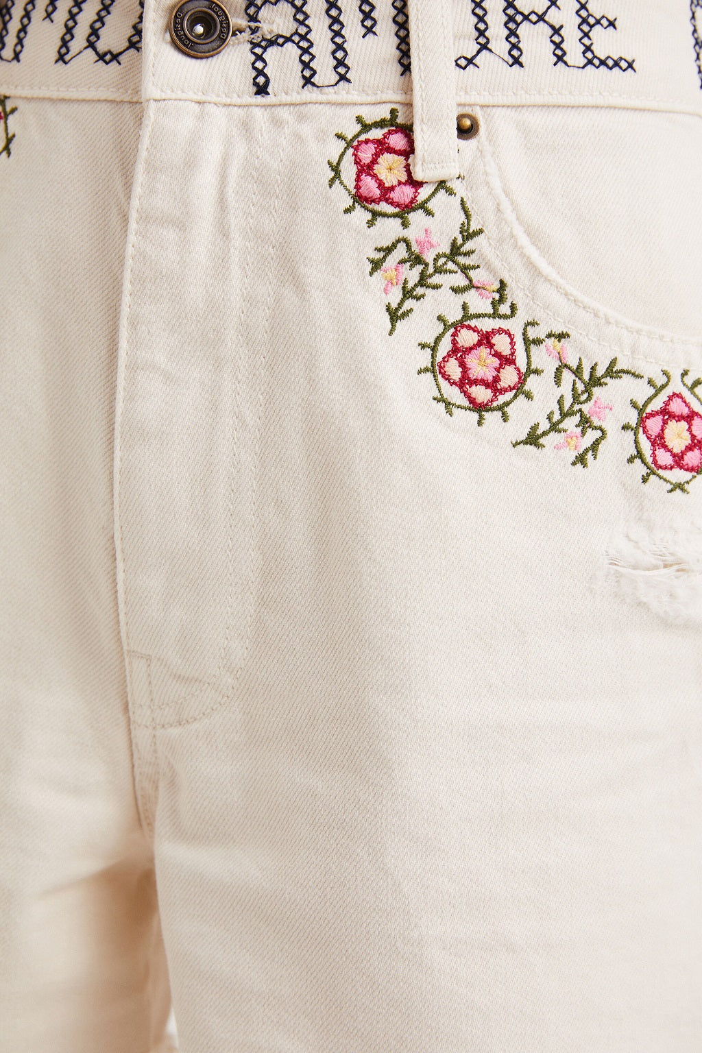 The Desigual Denim Laguna is a light, off-white denim shorts full of small, romantic details. The front features colorful, floral embroidery decorating the pockets, while the waistband displays the word "AMORE" in contrasting letters, as if hand-embroidered.