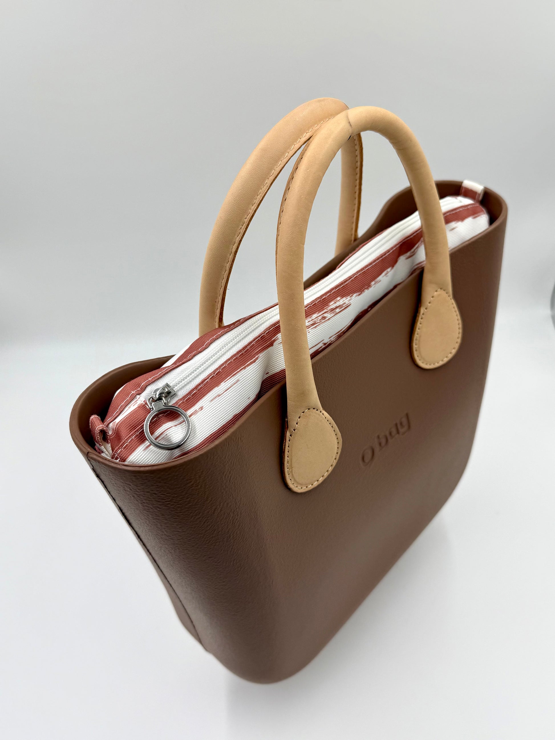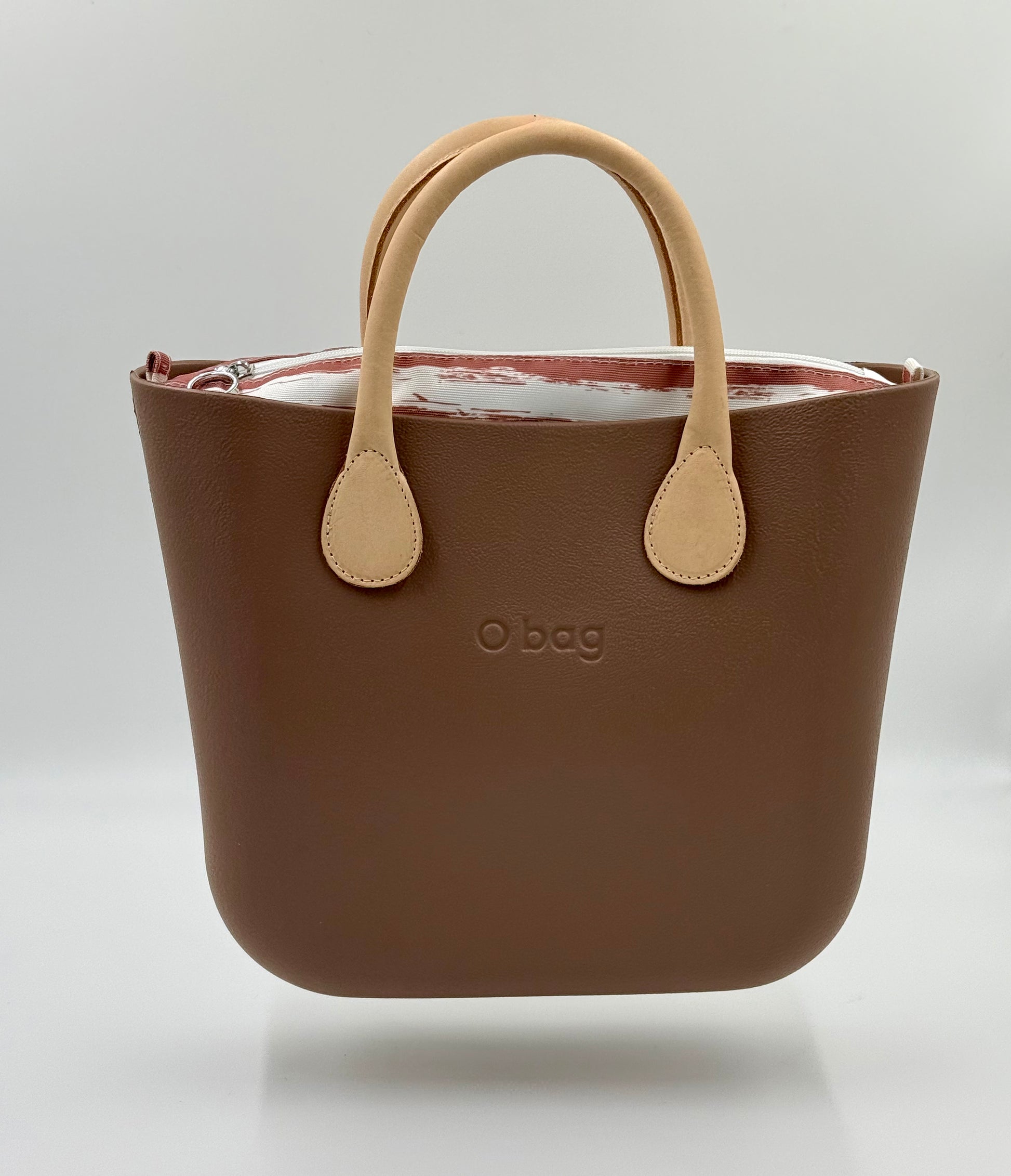 The O bag Mini is a feminine, compact bag for everyday use. The soft taupe/greige shade bag body is complemented by elegant cream-colored handles, and inside, a white-mauve striped zippered lining ensures your belongings are safe and organized.